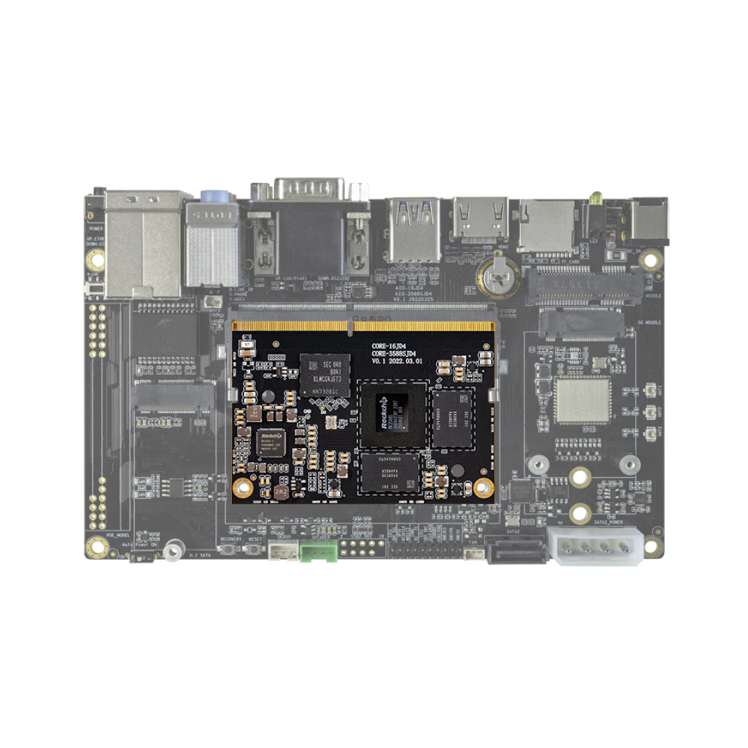 Powered by Rockchip RK35885 new-gen 8-core 64-bit processor, the core board can be configured with up to 32GB RAM. Capable of 8K video encoding and decoding, it provides abundant interfaces, supporting multiple hard disks, Gigabit Ethernet and dual-band WiFit. It also supports various operating systems. Backplane reference